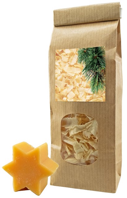 Inhalt: ca. 7 g Zirbenholzflocken, Schafmilchseife Stern Zirbenduft (ca. 12 g)